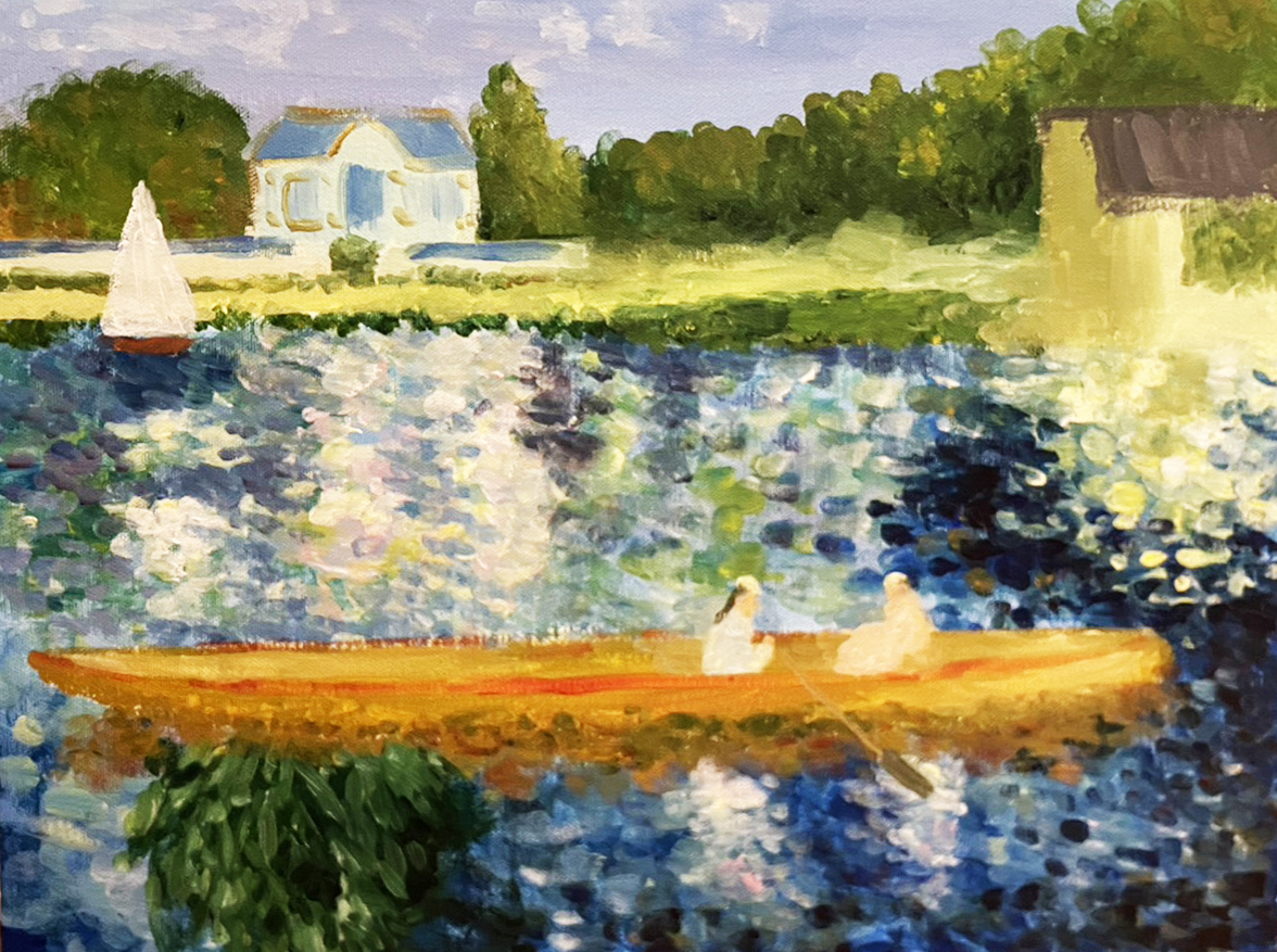 Boating on the Seine captures a leisurely moment of people enjoying a boat ride along the Seine under soft, shimmering light.