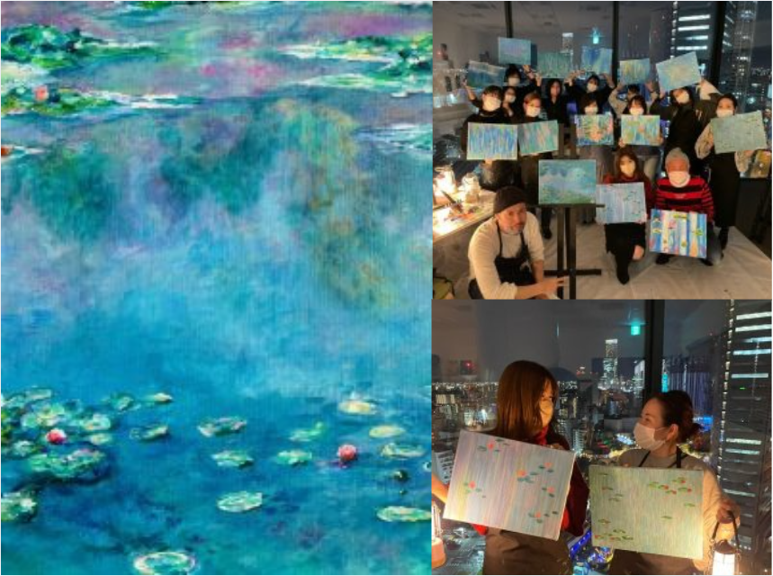 モネの睡蓮 Monet Waterlilies 『モネの睡蓮』 クロード・モネの代表作『モネの睡蓮』 フランスのジヴェルニーにある「水の庭」の池とそこに生育する睡蓮をモチーフに描かれています。 自身の思い描く睡蓮を描いてみましょう! 【 Artbar Osaka-Paint & Sip Studio アートなひとときを】 Artbar Osaka(アートバー大阪)ではワインやソフトドリンクを片手に 自分らしさ溢れるアート制作が楽しめます。 アーティストを中心とした経験豊富な講師が丁寧にサポートし、 絵を描くのが初めての方でも安心してご参加いただけます。 日常を離れ、自分だけの表現を見つけるリラックスした時間をお過ごしください。 【ご用意しているもの】 ・制作に必要な画材(キャンバス、絵具、エプロン等) ・ワイン、ソフトドリンク、スナック菓子の無料サービス ・完成した作品、手提げ袋(当日そのままお持ち帰りいただけます。) ・TULLY’S COFFEEのドリンク一杯 <Artbar Osaka Umeda / Artbar Lab