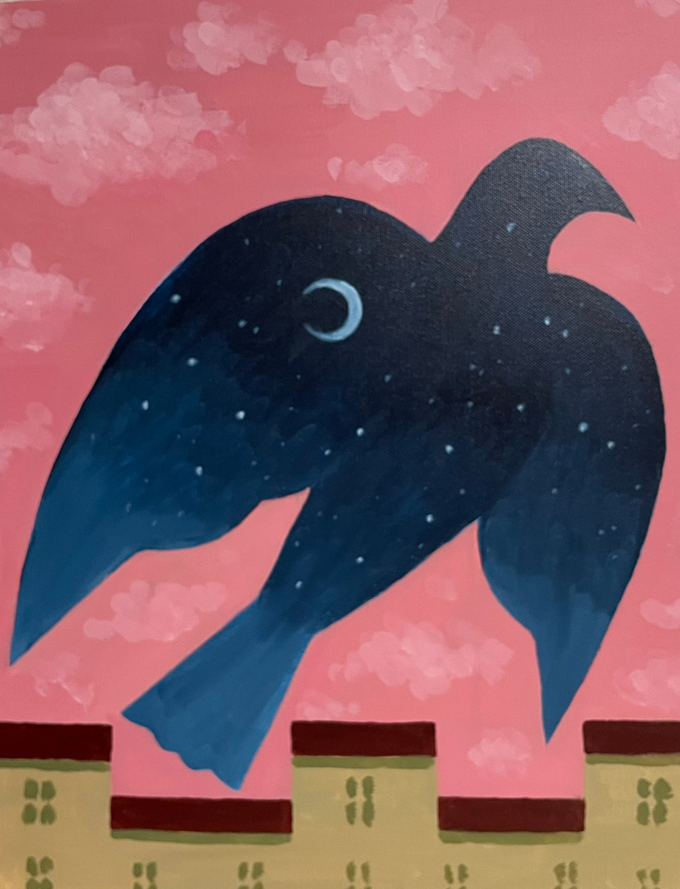 大きな鳥のシルエットの中に青空が描きこまれた不思議な絵。