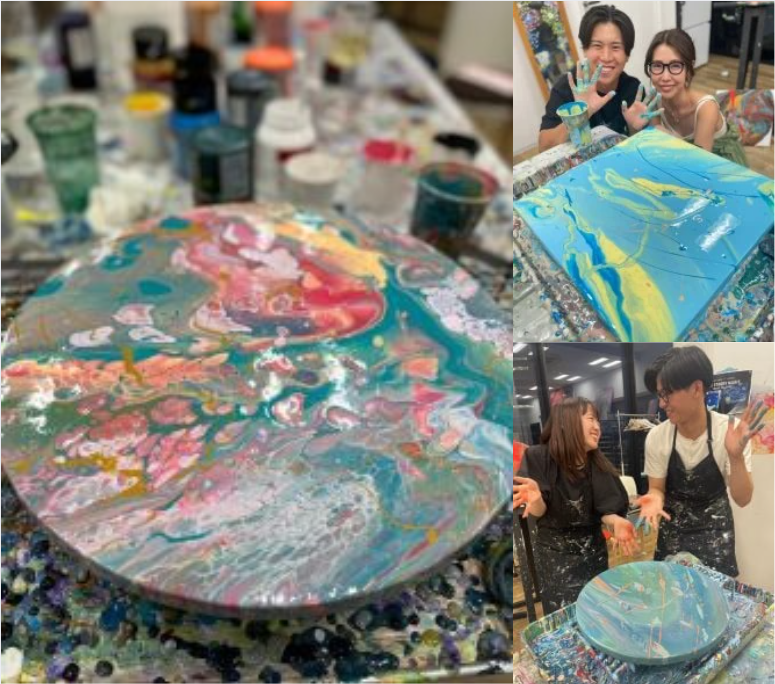 選べるキャンバスポーリングアート(たらし込み画法) Choose Canvas Paint Pouring 【ポーリングアート】 お好きな色を5色選んでいただき、混ぜ合わせていきます。 キャンバスの中でマーブリングさせたり、油を使い色と色を弾けさせて美しい模様を作ったり 混ぜてひっくり返して揺らして〜どんな作品になるかは最後までお楽しみです! この作品は乾燥に1週間程度時間がかかる為、当日お持ち帰り頂くことが出来ません。 10日前後に着払いでの配送になります。(乾燥状態によって前後します) 着払いのみでの対応となり、後日取りに来られる等は対応できません。 また宛先不明や保管期限を過ぎてこちらに返送された場合、返送の送料と再発送の送料をご負担いただきますのでご了承ください。 【 Artbar Osaka-Paint & Sip Studio